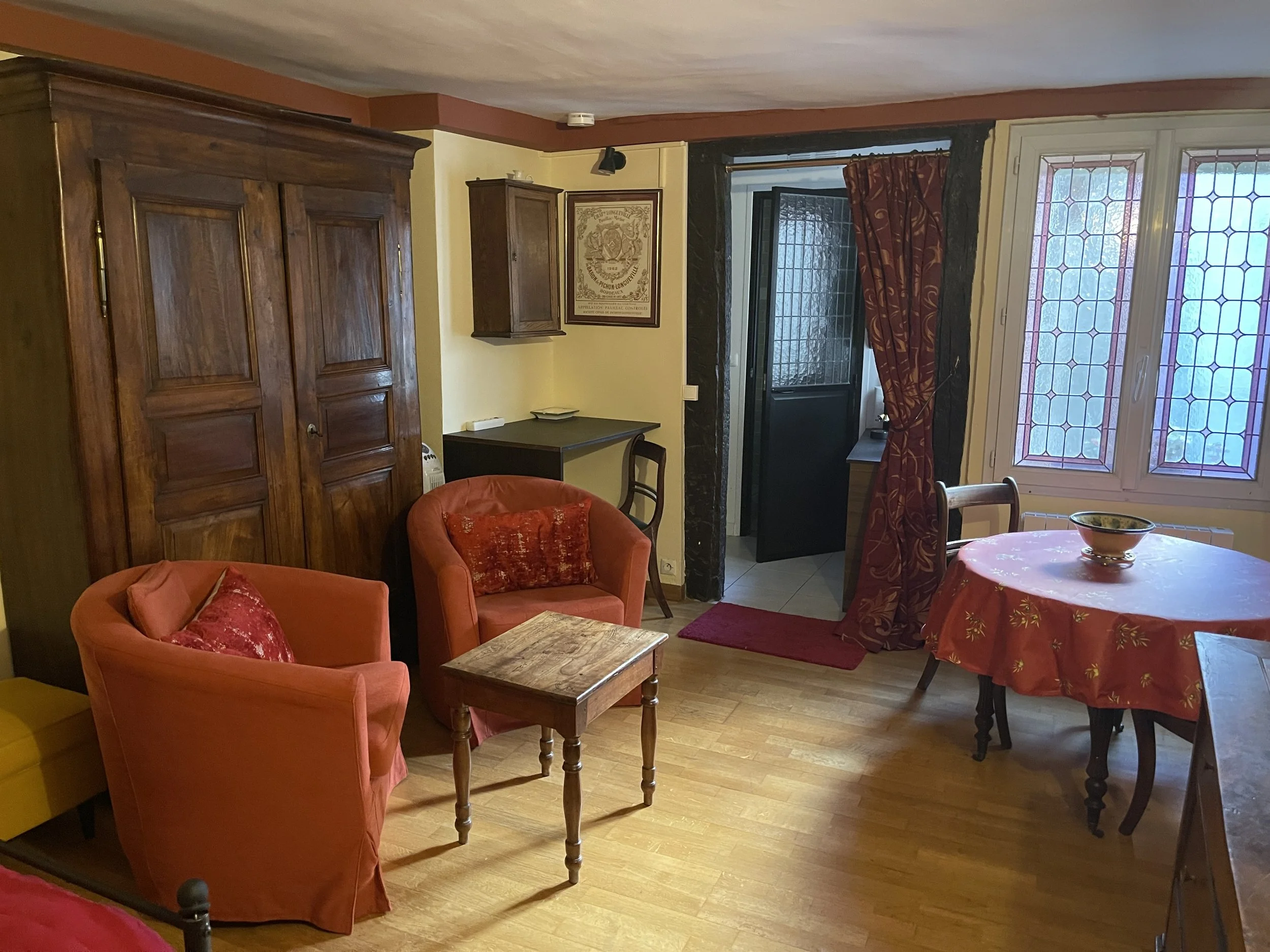 This delightful studio offers a spacious open-plan layout, featuring a comfortable queen bed alongside a beautiful antique wardrobe and a matching chest of drawers. The room is thoughtfully appointed with a cozy sitting area complete with inviting armchairs, a dedicated workspace with additional power outlets, and a charming dining area. Warm wooden flooring extends throughout, lending the space a welcoming and homely atmosphere.